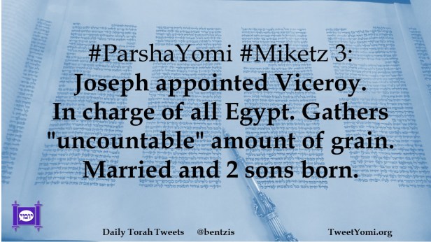 #ParshaYomi #Miketz 3: Joseph appointed Viceroy. In charge of all Egypt. Gathers “uncountable” amount of grain. Married and 2 sons born.