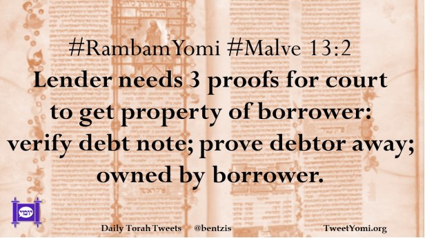 #RambamYomi #Malve 13:2 Lender needs 3 proofs for court to get property of borrower: verify debt note; prove debtor away; owned by borrower.