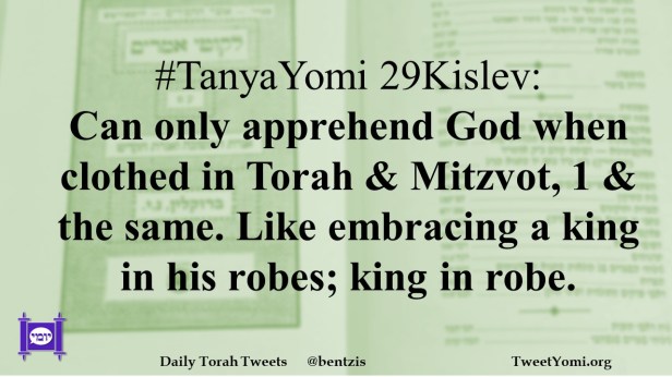 #TanyaYomi 29Kislev: Can only apprehend God when clothed in Torah & Mitzvot, 1 & the same. Like embracing a king in his robes; king in robe.