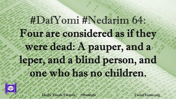 DafYomi, Nedarim #DafYomi #Nedarim 64 Date: February 27, 2023Author: netanelspitz #DafYomi #Nedarim 64: Four are considered as if they were dead: A pauper, and a leper, and a blind person, and one who has no children. Share this: Share on X (Opens in new window) X Share on Facebook (Opens in new window) Facebook Like Loading... Related