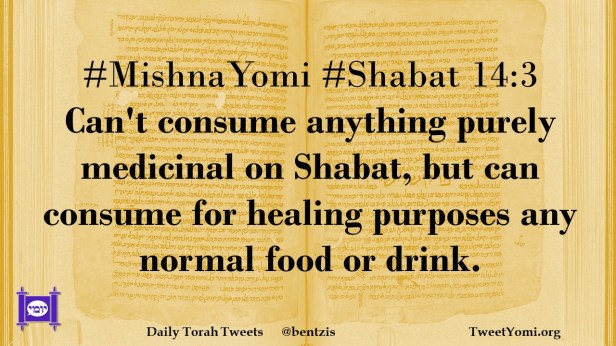 #MishnaYomi #Shabat 14:3 Can’t consume anything purely medicinal on Shabat, but can consume for healing purposes any normal food or drink.