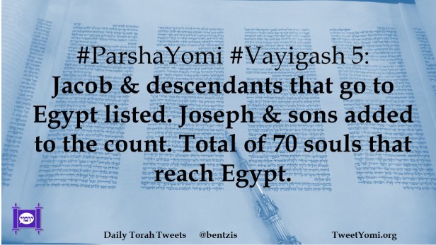 #ParshaYomi #Vayigash 5: Jacob & descendants that go to Egypt listed. Joseph & sons added to the count. Total of 70 souls that reach Egypt.