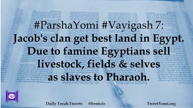 #ParshaYomi #Vayigash 7: Jacob’s clan get best land in Egypt. Due to famine Egyptians sell livestock, fields & selves as slaves to Pharaoh.