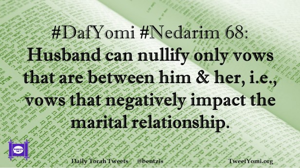 DafYomi, Nedarim #DafYomi #Nedarim 68 Date: February 28, 2023Author: netanelspitz #DafYomi #Nedarim 68: Husband can nullify only vows that are between him & her, i.e., vows that negatively impact the marital relationship. Share this: Share on X (Opens in new window) X Share on Facebook (Opens in new window) Facebook Like Loading... Related
