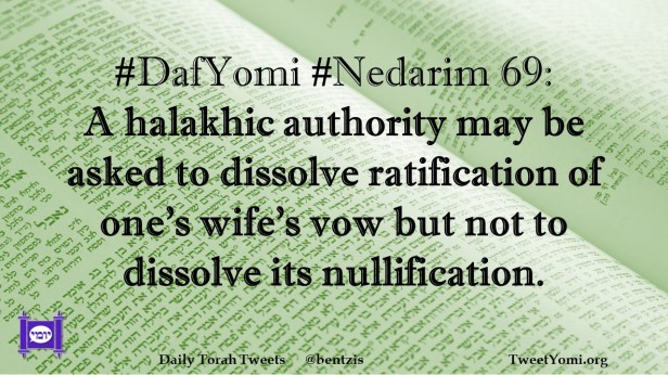 DafYomi, Nedarim #DafYomi #Nedarim 69 Date: February 28, 2023Author: netanelspitz #DafYomi #Nedarim 69: A halakhic authority may be asked to dissolve ratification of one’s wife’s vow but not to dissolve its nullification. Share this: Share on X (Opens in new window) X Share on Facebook (Opens in new window) Facebook Like Loading... Related