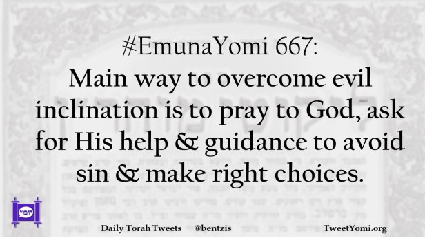 #EmunaYomi 667: Main way to overcome evil inclination is to pray to God, ask for His help & guidance to avoid sin & make right choices.