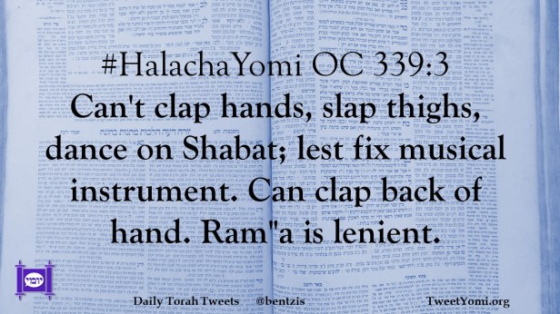#HalachaYomi OC 339:3 Can’t clap hands, slap thighs, dance on Shabat; lest fix musical instrument. Can clap back of hand. Ram”a is lenient.