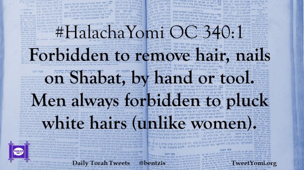 #HalachaYomi OC 340:1 Forbidden to remove hair, nails on Shabat, by hand or tool. Men always forbidden to pluck white hairs (unlike women).