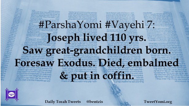 ParshaYomi, Vayehi #ParshaYomi #Vayehi 7 Date: February 28, 2023Author: netanelspitz #ParshaYomi #Vayehi 7: Joseph lived 110 yrs. Saw great-grandchildren born. Foresaw Exodus. Died, embalmed & put in coffin. Share this: Share on X (Opens in new window) X Share on Facebook (Opens in new window) Facebook Like Loading... Related
