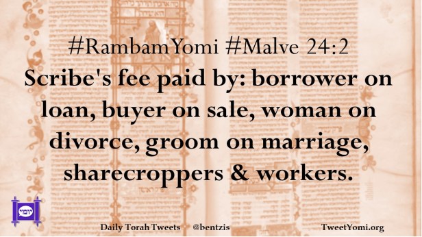 #RambamYomi #Malve 24:2 Scribe’s fee paid by: borrower on loan, buyer on sale, woman on divorce, groom on marriage, sharecroppers & workers.