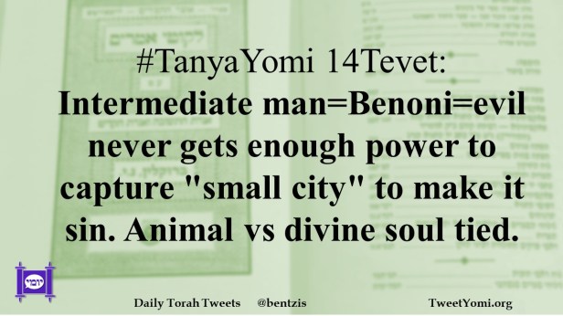 #TanyaYomi 14Tevet: Intermediate man=Benoni=evil never gets enough power to capture “small city” to make it sin. Animal vs divine soul tied.