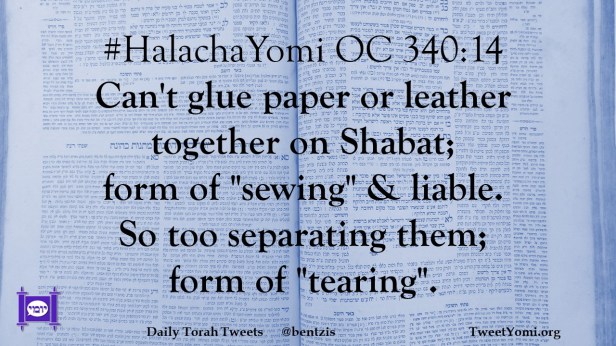 #HalachaYomi OC 340:14 Can’t glue paper or leather together on Shabat; form of “sewing” & liable. So too separating them; form of “tearing”.