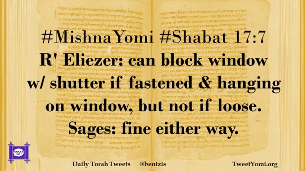 #MishnaYomi #Shabat 17:7 R’ Eliezer: can block window w/ shutter if fastened & hanging on window, but not if loose. Sages: fine either way.