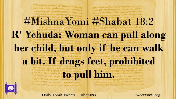 #MishnaYomi #Shabat 18:2 R’ Yehuda: Woman can pull along her child, but only if he can walk a bit. If drags feet, prohibited to pull him.