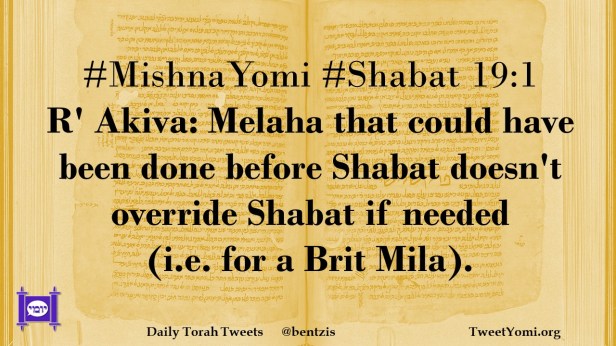 #MishnaYomi #Shabat 19:1 R’ Akiva: Melaha that could have been done before Shabat doesn’t override Shabat if needed (i.e. for a Brit Mila).