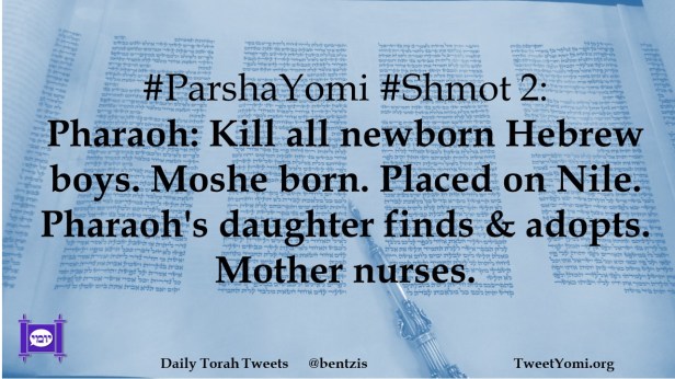 #ParshaYomi #Shmot 2: Pharaoh: Kill all newborn Hebrew boys. Moshe born. Placed on Nile. Pharaoh’s daughter finds & adopts. Mother nurses.