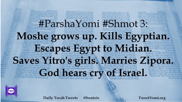 #ParshaYomi #Shmot 3: Moshe grows up. Kills Egyptian. Escapes Egypt to Midian. Saves Yitro’s girls. Marries Zipora. God hears cry of Israel.
