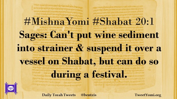 #MishnaYomi #Shabat 20:1 Sages: Can’t put wine sediment into strainer & suspend it over a vessel on Shabat, but can do so during a festival.