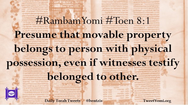 #RambamYomi #Toen 8:1 Presume that movable property belongs to person with physical possession, even if witnesses testify belonged to other.