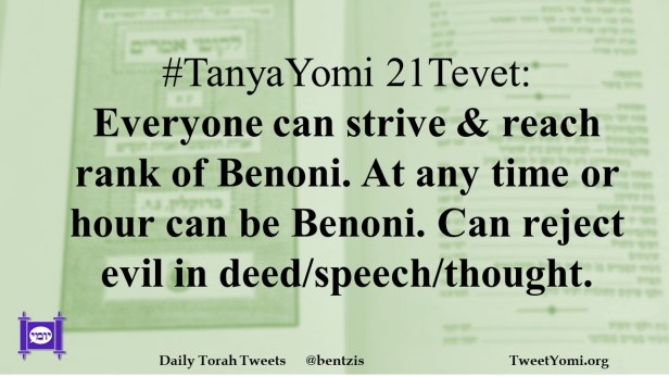 #TanyaYomi 21Tevet: Everyone can strive & reach rank of Benoni. At any time or hour can be Benoni. Can reject evil in deed/speech/thought.