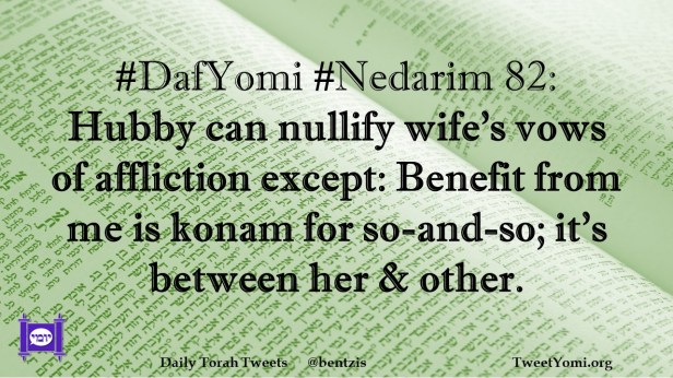 DafYomi, Nedarim #DafYomi #Nedarim 82 Date: March 10, 2023Author: netanelspitz #DafYomi #Nedarim 82: Hubby can nullify wife’s vows of affliction except: Benefit from me is konam for so-and-so; it’s between her & other. Share this: Share on X (Opens in new window) X Share on Facebook (Opens in new window) Facebook Like Loading... Related