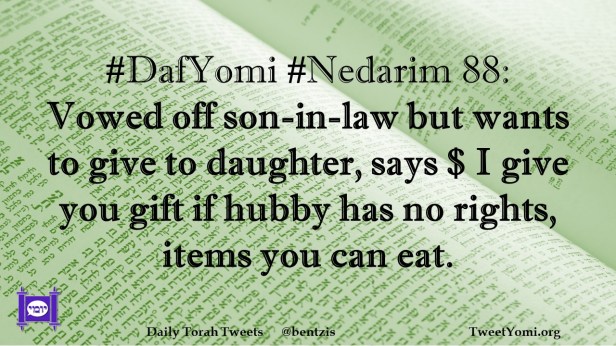 DafYomi, Nedarim #DafYomi #Nedarim 88 Date: March 12, 2023Author: netanelspitz #DafYomi #Nedarim 88: Vowed off son-in-law but wants to give to daughter, says $ I give you gift if hubby has no rights, items you can eat. Share this: Share on X (Opens in new window) X Share on Facebook (Opens in new window) Facebook Like Loading... Related