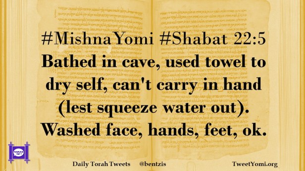 #MishnaYomi #Shabat 22:5 Bathed in cave, used towel to dry self, can’t carry in hand (lest squeeze water out). Washed face, hands, feet, ok.