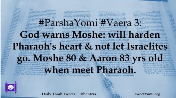 #ParshaYomi #Vaera 3: God warns Moshe: will harden Pharaoh’s heart & not let Israelites go. Moshe 80 & Aaron 83 yrs old when meet Pharaoh.