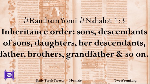 #RambamYomi #Nahalot 1:3 Inheritance order: sons, descendants of sons, daughters, her descendants, father, brothers, grandfather & so on.