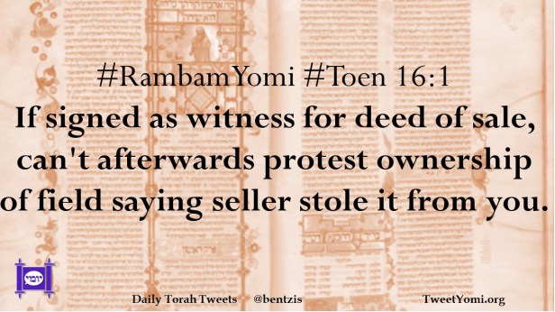 #RambamYomi #Toen 16:1 If signed as witness for deed of sale, can’t afterwards protest ownership of field saying seller stole it from you.