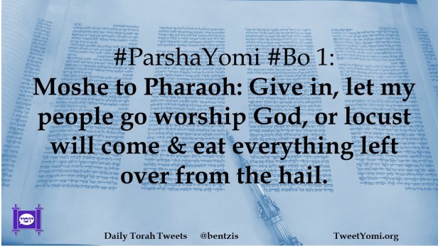 #ParshaYomi #Bo 1: Moshe to Pharaoh: Give in, let my people go worship God, or locust will come & eat everything left over from the hail.