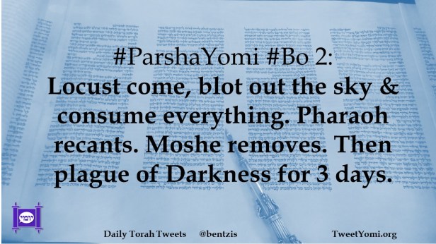 #ParshaYomi #Bo 2: Locust come, blot out the sky & consume everything. Pharaoh recants. Moshe removes. Then plague of Darkness for 3 days.