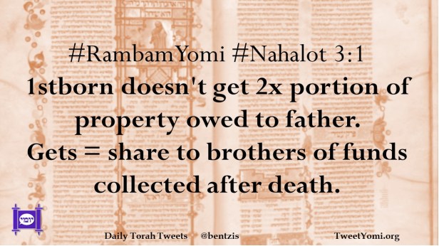 #RambamYomi #Nahalot 3:1 1stborn doesn’t get 2x portion of property owed to father. Gets = share to brothers of funds collected after death.