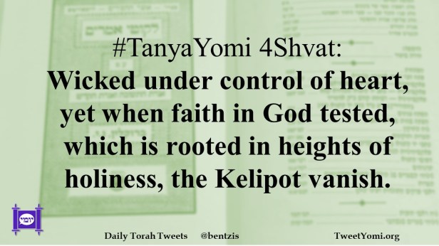 #TanyaYomi 4Shvat: Wicked under control of heart, yet when faith in God tested, which is rooted in heights of holiness, the Kelipot vanish.