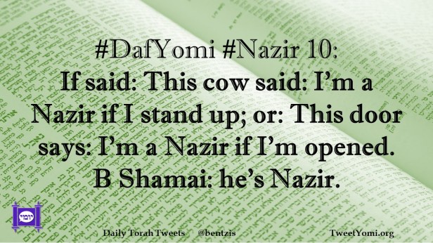 DafYomi, Nazir #DafYomi #Nazir 10 Date: March 14, 2023Author: netanelspitz #DafYomi #Nazir 10: If said: This cow said: I’m a Nazir if I stand up; or: This door says: I’m a Nazir if I’m opened. B Shamai: he’s Nazir. Share this: Share on X (Opens in new window) X Share on Facebook (Opens in new window) Facebook Like Loading... Related