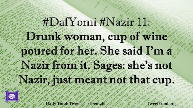 DafYomi, Nazir #DafYomi #Nazir 11 Date: March 14, 2023Author: netanelspitz #DafYomi #Nazir 11: Drunk woman, cup of wine poured for her. She said I’m a Nazir from it. Sages: she’s not Nazir, just meant not that cup. Share this: Share on X (Opens in new window) X Share on Facebook (Opens in new window) Facebook Like Loading... Related