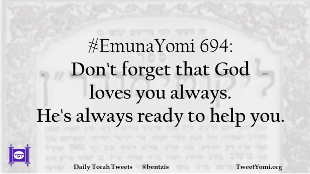 EmunaYomi #EmunaYomi 694 Date: March 14, 2023Author: netanelspitz #EmunaYomi 694: Don’t forget that God loves you always. He’s always ready to help you. Share this: Share on X (Opens in new window) X Share on Facebook (Opens in new window) Facebook Like Loading... Related