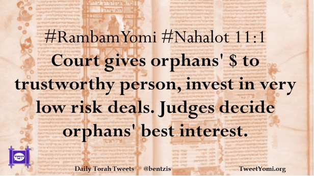 #RambamYomi #Nahalot 11:1 Court gives orphans’ $ to trustworthy person, invest in very low risk deals. Judges decide orphans’ best interest.