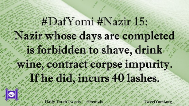 DafYomi, Nazir #DafYomi #Nazir 15 Date: March 15, 2023Author: netanelspitz #DafYomi #Nazir 15: Nazir whose days are completed is forbidden to shave, drink wine, contract corpse impurity. If he did, incurs 40 lashes. Share this: Share on X (Opens in new window) X Share on Facebook (Opens in new window) Facebook Like Loading... Related
