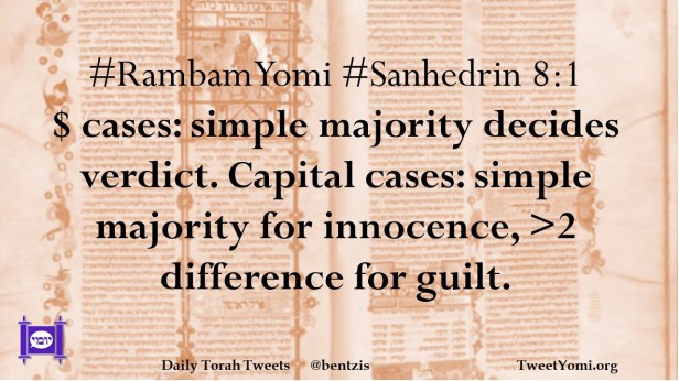 #RambamYomi #Sanhedrin 8:1 $ cases: simple majority decides verdict. Capital cases: simple majority for innocence, >2 difference for guilt.