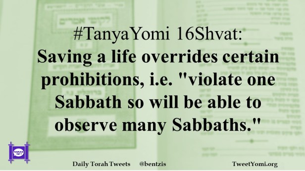 #TanyaYomi 16Shvat: Saving a life overrides certain prohibitions, i.e. “violate one Sabbath so will be able to observe many Sabbaths.”