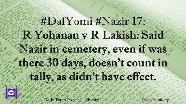 DafYomi, Nazir #DafYomi #Nazir 17 Date: March 16, 2023Author: netanelspitz #DafYomi #Nazir 17: R Yohanan v R Lakish: Said Nazir in cemetery, even if was there 30 days, doesn’t count in tally, as didn’t have effect. Share this: Share on X (Opens in new window) X Share on Facebook (Opens in new window) Facebook Like Loading... Related