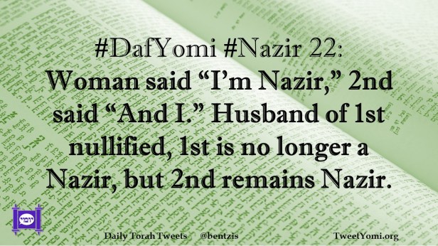 DafYomi, Nazir #DafYomi #Nazir 22 Date: March 16, 2023Author: netanelspitz #DafYomi #Nazir 22: Woman said “I’m Nazir,” 2nd said “And I.” Husband of 1st nullified, 1st is no longer a Nazir, but 2nd remains Nazir. Share this: Share on X (Opens in new window) X Share on Facebook (Opens in new window) Facebook Like Loading... Related