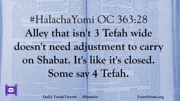 #HalachaYomi OC 363:28 Alley that isn’t 3 Tefah wide doesn’t need adjustment to carry on Shabat. It’s like it’s closed. Some say 4 Tefah.