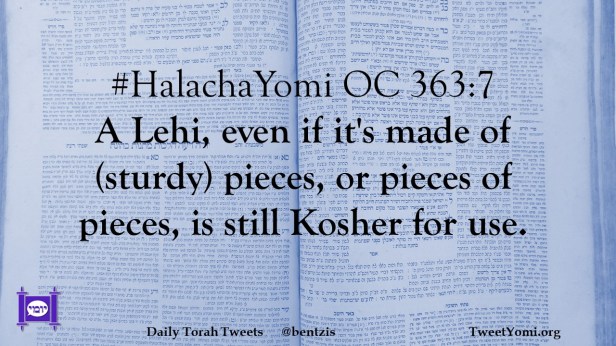 HalachaYomi #HalachaYomi OC 363:7 Date: March 16, 2023Author: netanelspitz #HalachaYomi OC 363:7 A Lehi, even if it’s made of (sturdy) pieces, or pieces of pieces, is still Kosher for use. Share this: Share on X (Opens in new window) X Share on Facebook (Opens in new window) Facebook Like Loading... Related