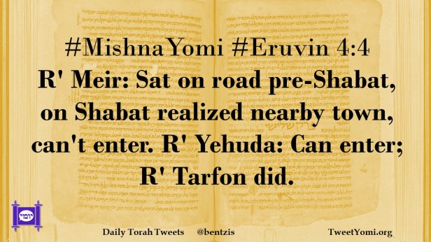 #MishnaYomi #Eruvin 4:4 R’ Meir: Sat on road pre-Shabat, on Shabat realized nearby town, can’t enter. R’ Yehuda: Can enter; R’ Tarfon did.