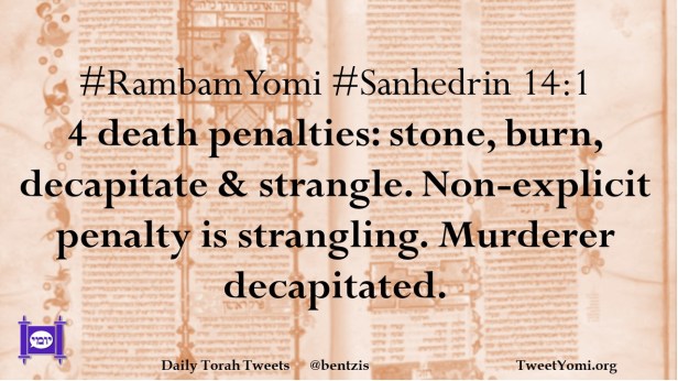 #RambamYomi #Sanhedrin 14:1 4 death penalties: stone, burn, decapitate & strangle. Non-explicit penalty is strangling. Murderer decapitated.