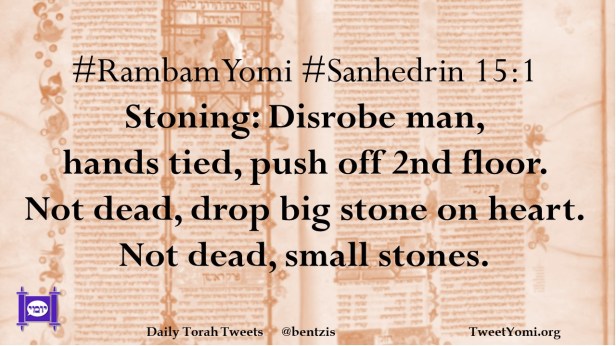 #RambamYomi #Sanhedrin 15:1 Stoning: Disrobe man, hands tied, push off 2nd floor. Not dead, drop big stone on heart. Not dead, small stones.