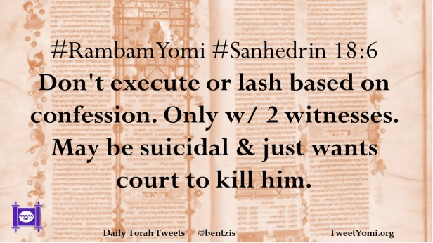 #RambamYomi #Sanhedrin 18:6 Don’t execute or lash based on confession. Only w/ 2 witnesses. May be suicidal & just wants court to kill him.