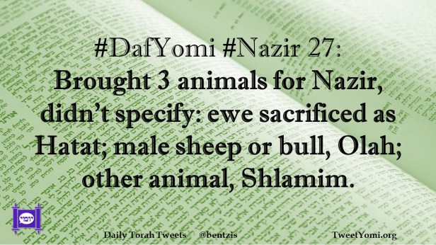 DafYomi, Nazir #DafYomi #Nazir 27 Date: March 19, 2023Author: netanelspitz #DafYomi #Nazir 27: Brought 3 animals for Nazir, didn’t specify: ewe sacrificed as Hatat; male sheep or bull, Olah; other animal, Shlamim. Share this: Share on X (Opens in new window) X Share on Facebook (Opens in new window) Facebook Like Loading... Related
